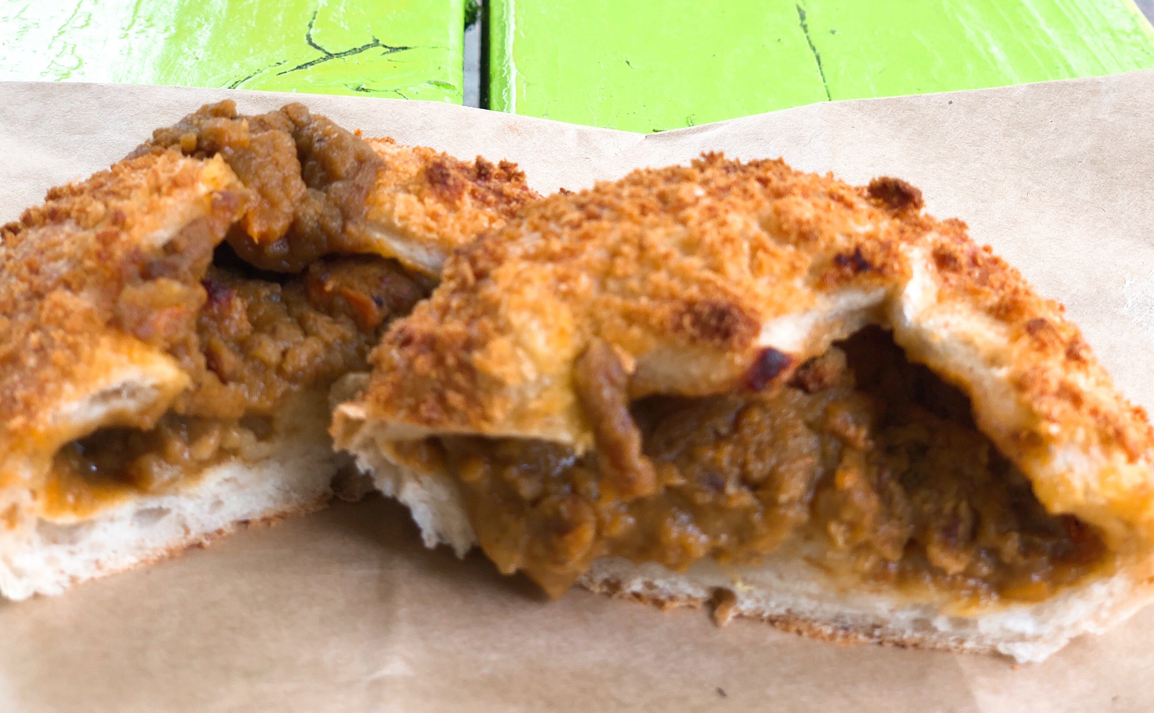 挽肉、ジャガイモ、玉ねぎといった具材がたっぷり入った、揚げてない衣が付いた焼きカレー。
